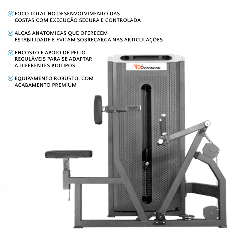 "Foque no desenvolvimento total das costas com a Remada Sentada VO6. Com pegada ergonômica, movimento guiado e ajustes precisos, o equipamento proporciona estabilidade, segurança e máxima ativação muscular. Ideal para treinos controlados e eficientes, seja na musculação, reabilitação ou alta performance. Um equipamento robusto e essencial na linha de dorsais da sua academia."